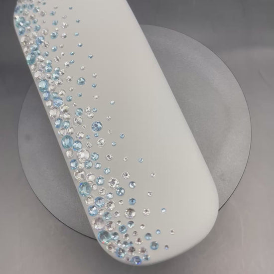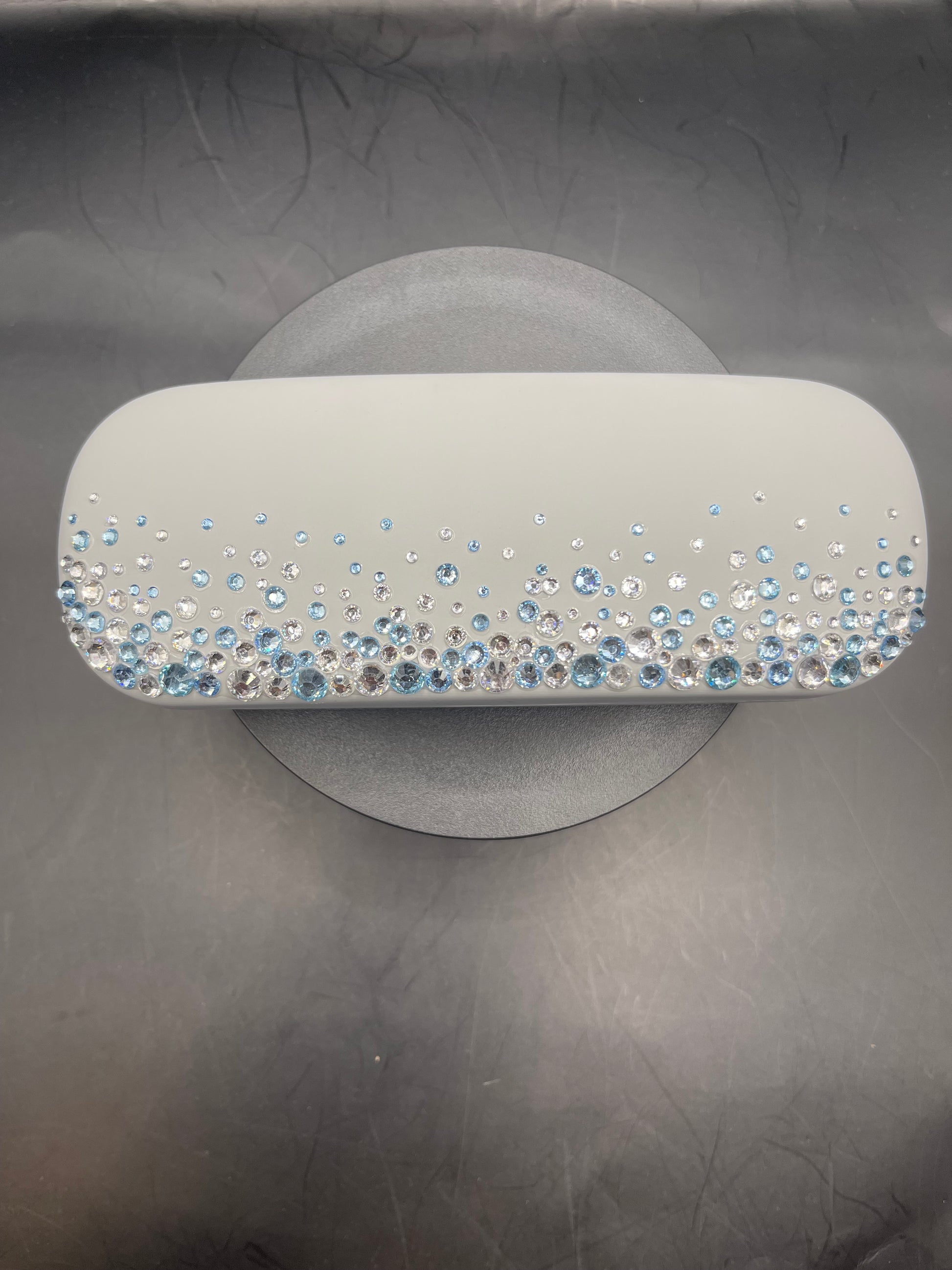 Dieses Brillenetui wurde mit hunderten funkelnden Strasssteinen in klaren und eisblauen Tönen von Hand verziert. Der sanfte Glitzerverlauf wirkt wie frostige Schneekristalle im Licht – zart, clean und dennoch absolut auffällig.