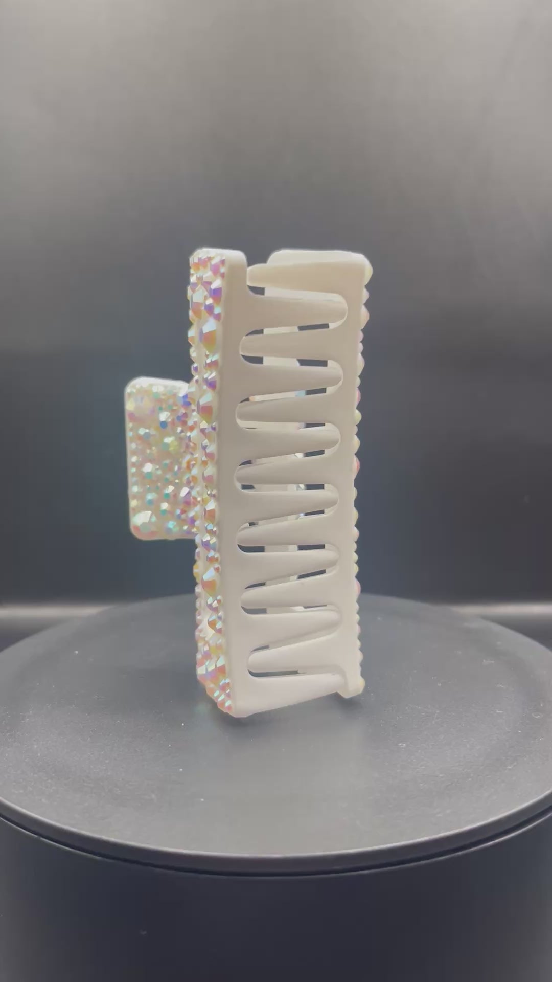 Diese weisse, rechteckige Haarklammer (9 cm) ist ein echter Sparkle-Magnet: rundum mit irisierenden Crystal-AB Strasssteinen verziert – jeder einzelne Stein wird von mir von Hand aufgeklebt. Je nach Lichteinfall schimmert sie in sanften Regenbogen-Reflexen und sorgt für einen edlen, aber auffälligen Look. ✨