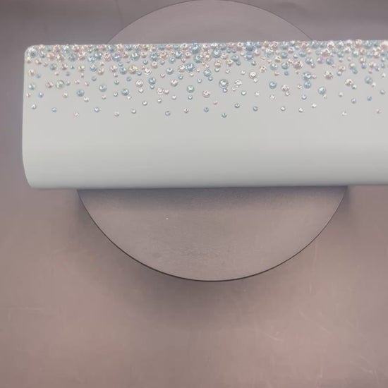 Dieses hellblaue Brillenetui wurde von Hand mit hunderten glitzernden Strasssteinen in Blau und Silber verziert – jeder Stein einzeln gesetzt, damit dein Etui im Licht schimmert.
