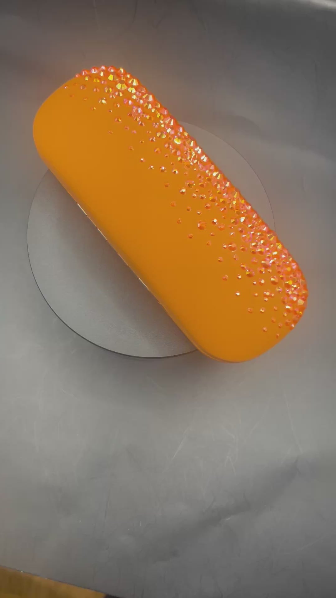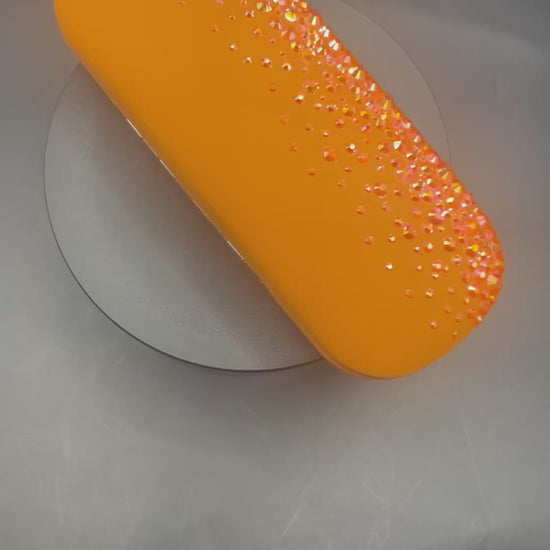 Dieses orangefarbene Brillenetui wurde in liebevoller Handarbeit mit funkelnden Strasssteinen beklebt. Jedes Steinchen sitzt perfekt – für einen einzigartigen, glitzernden Look, der begeistert.