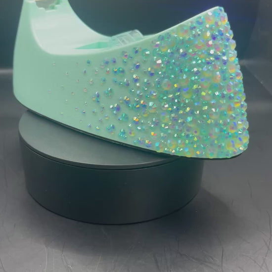 Der Strassverlauf in Blau, Grün und holografischen Tönen wird in sorgfältiger Handarbeit geklebt. Jedes Steinchen sitzt fest und verleiht dem Abroller einen einzigartigen Sparkle, der sofort gute Laune macht.