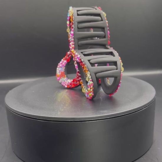 Jeder einzelne Strassstein wurde von Hand aufgeklebt – sorgfältig, glitzernd und absolut einzigartig. Die warmen Rot-, Pink- und Gelbtöne verbinden sich mit irisierenden Akzenten und schaffen einen funkelnden Rainbow-Glow, der in jedem Licht magisch wirkt.