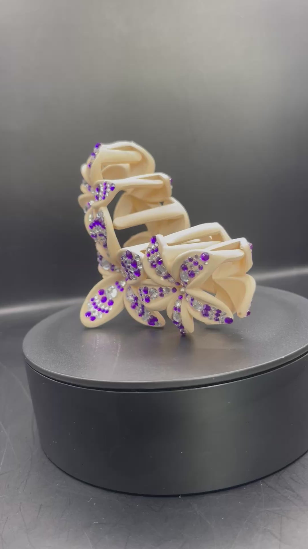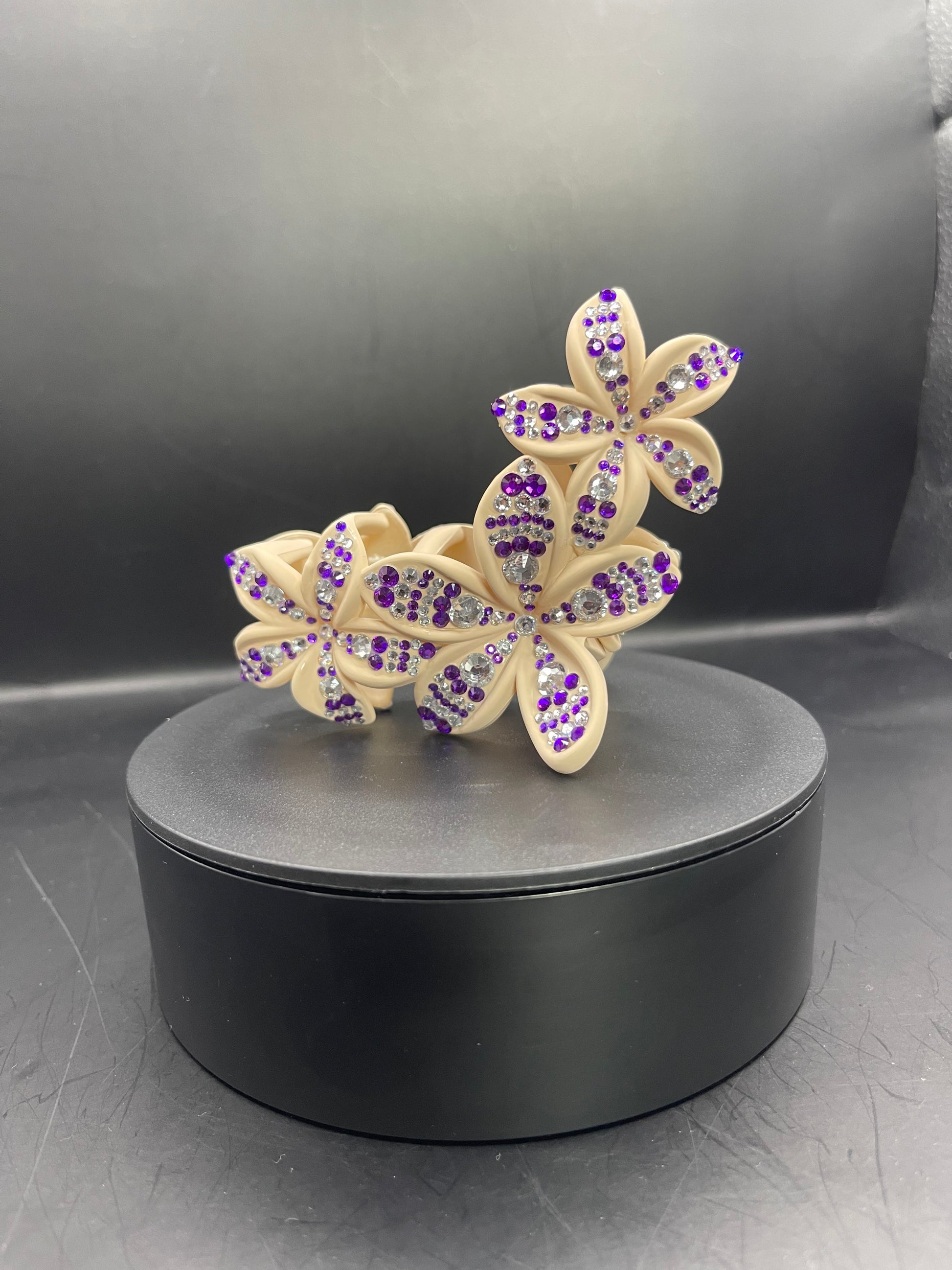 Die sechs Blumenformen wurden liebevoll von Hand mit hochwertigen lila und silbernen Strasssteinen beklebt, sodass ein lebendiges, glitzerndes Muster entsteht, das im Licht traumhaft schimmert.