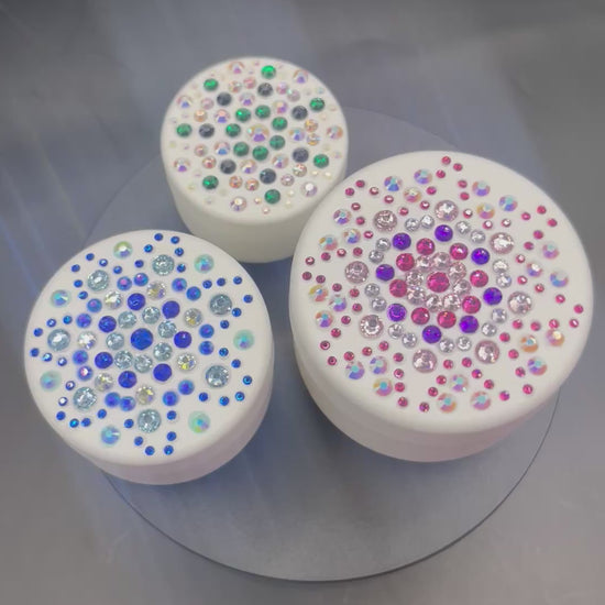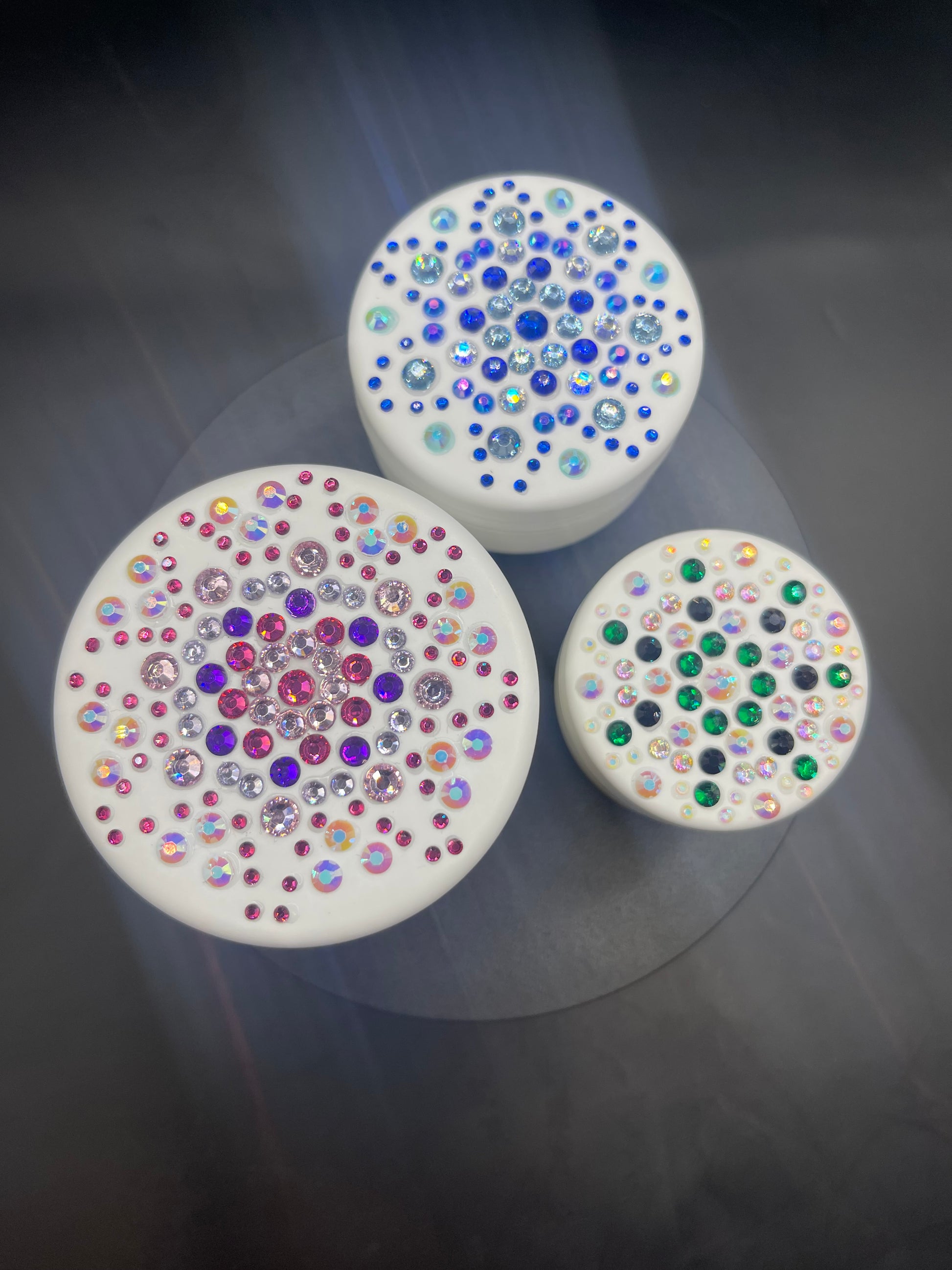 Diese drei eleganten Dosen verwandeln jede Aufbewahrung in ein kleines Highlight. Der Deckel jeder Dose ist von Hand mit funkelnden Strasssteinchen verziert – jedes Stück ein echtes Unikat von Theglitterthing.
