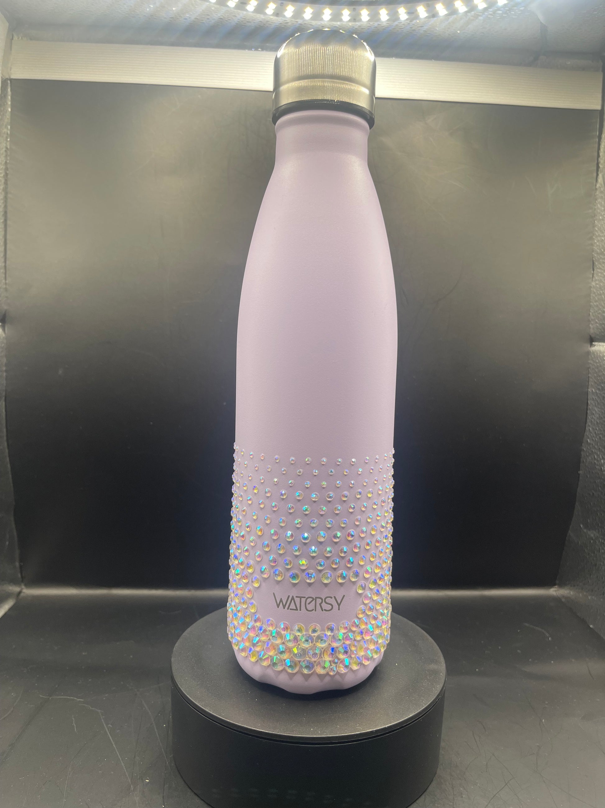 Jedes einzelne Strasssteinchen wird von Hand angebracht – sorgfältig, präzise und mit ganz viel Liebe zum Detail. Die matte Lavendel-Oberfläche in Kombination mit dem funkelnden Glitzer-Gradient verleiht der Flasche einen luxuriösen, eleganten Look.