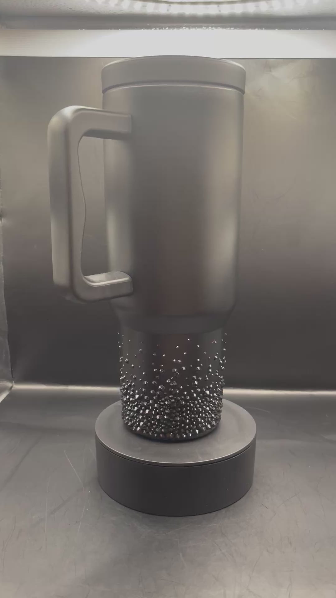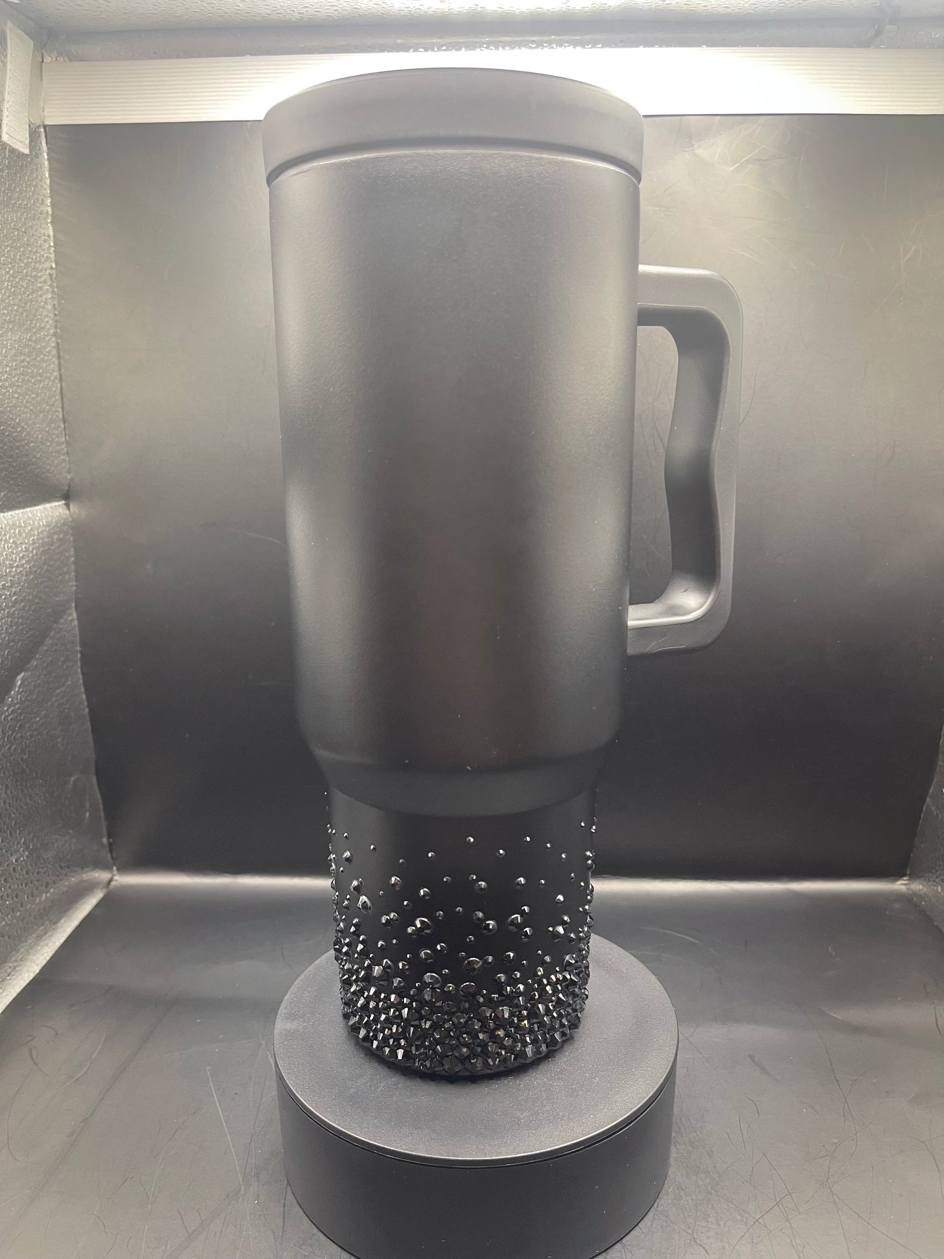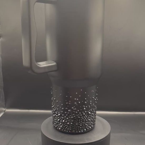 Dieser matt-schwarze Thermobecher wurde am unteren Bereich von Hand mit schwarzen Strasssteinen veredelt – jeder Stein einzeln geklebt. Das dezente Funkeln trifft auf minimalistisches Design und macht diesen Becher zu einem echten Statement-Piece – ob im Büro, im Auto oder unterwegs.